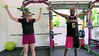 Sensual ebony cougar Naomi Foxxx bangs horny milky guy after exercise in the sport - milf body