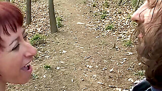 Horny mother-in-law satisfies herself in nature