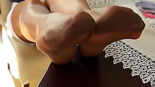 Silky nylon with smooth seams, footjob with humpback cumshot